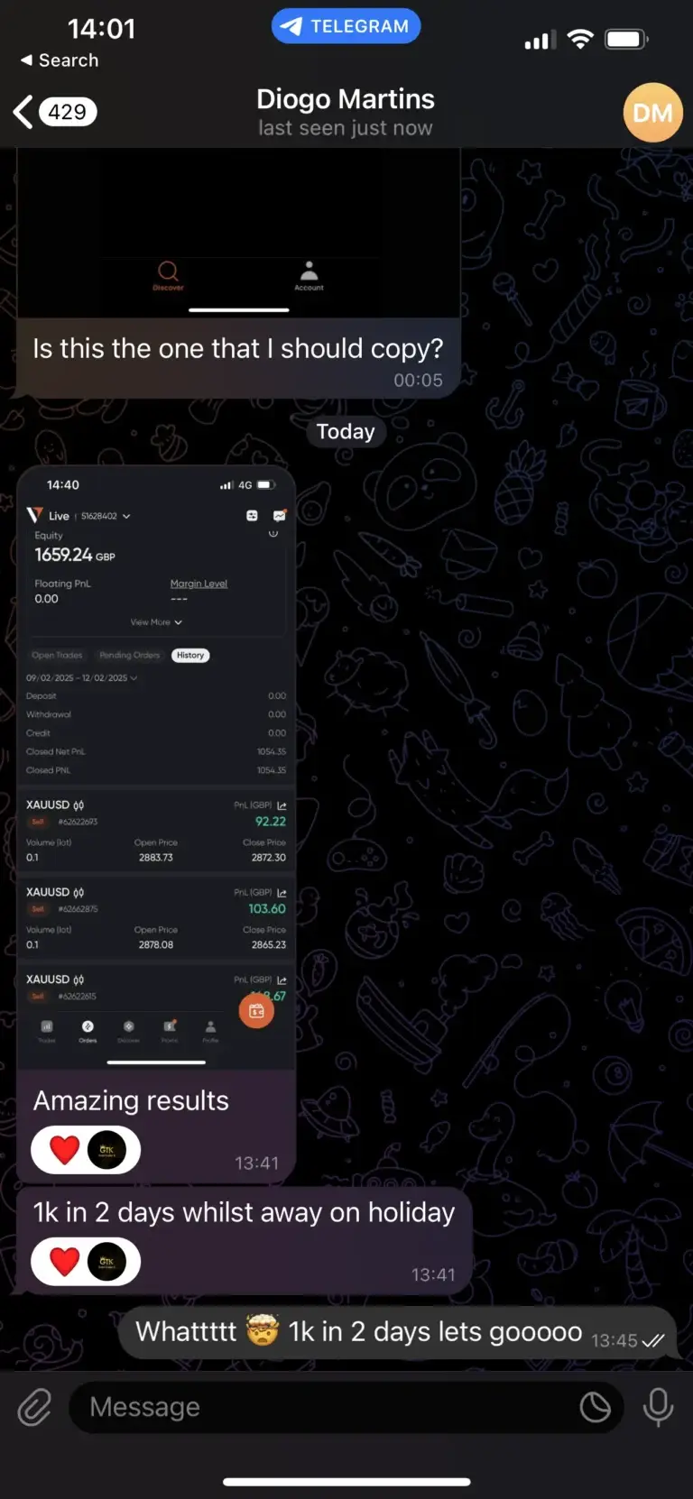 "Only started trading with Kay today and his experience in the markets along side his transparency makes understanding and placing his trades easy and quick so that everyone can make profit. I myself have already made a profit even though I only started today. Joining in on this will be the best decision you’ve made."