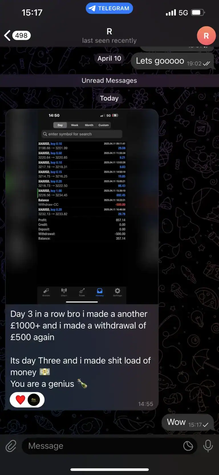 "Absolutely fantastic trader that cares about people and their wins. He’s very active during the trade and guides us through every step of each trade daily. Provides daily analysis too which helps us gain knowledge and understanding of what we’re actually doing. Tried other traders and definitely sticking with this one!"